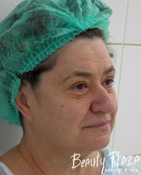 Of course, it was the daughter who made her mom to come initially. As we can see on the photographs her conditions was serious and all the possible age-related changes were present. IT was a huge work: endoscopic lift of the upper part of the face, plastic surgery of the neck and cheeks along with myofascial plastic surgery, liposuction of the gill and cheeks, transconjunctival blepharoplasty of the lower eyelids with laser polishing of the skin of the upper and lower eyelids. Surgery duration 2 h 50 min. Inpatient care for 2 days, compression garments for 10 days, aftercare for 14 days.