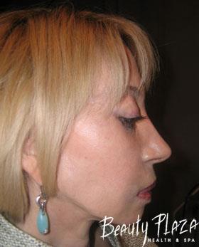 Performed: removal of the complications of gel injections, two procedures of internal lift SMAS with the application of SmartLift® and SmartVolume® diffusion attachments that shaped the clear oval of the face, one procedure of Photolift® that secured the ideal skin quality. The next stage of our work was the nonsurgical rhinoplasty that significantly reduced the size of the nose and made it look elegant. It ideally fitted the new image of the patient. Moreover, as a result of such transformations her asymmetry became less visible.