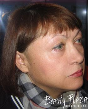 Stage by stage injections of fat tissue lipolysis factor were made in some regions of the face: chin, lower part of the face and the region of the lower eyelids. Two procedures of internal lift SMAS® created the new shape of the face with clear oval lines, strengthened the tissues by creating the firm tandem between the muscular tissue, subcutaneous fat tissue and derma. We even improved the effect more by the application of PeriOrbital® attachment of internal lift system SMAS® thus significantly reducing the ptosis of the upper eyelids.