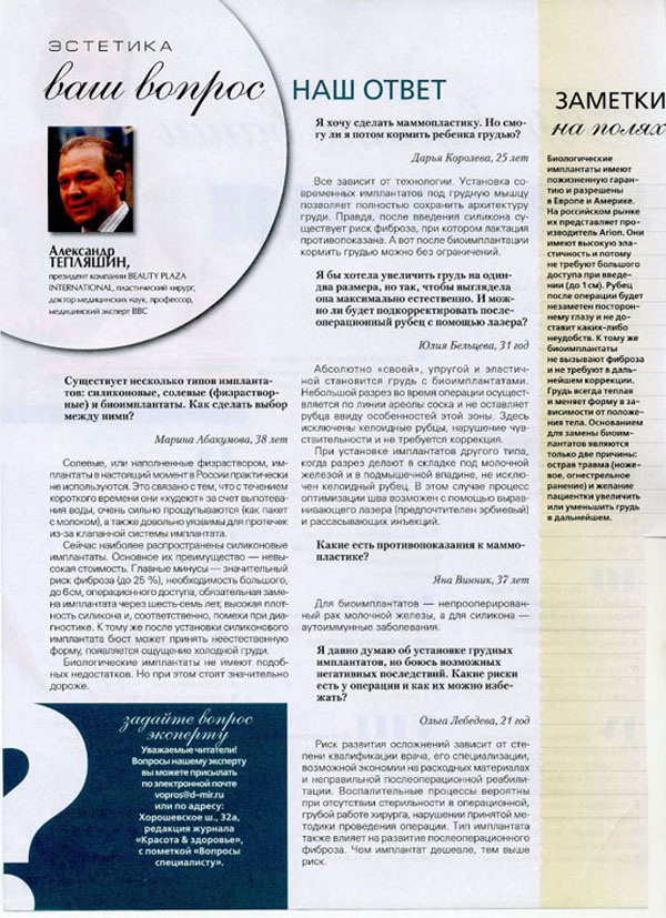 Доктор медицинских наук, профессор Александр Тепляшин отвечает на вопросы читателей журнала «Красота и здоровье».