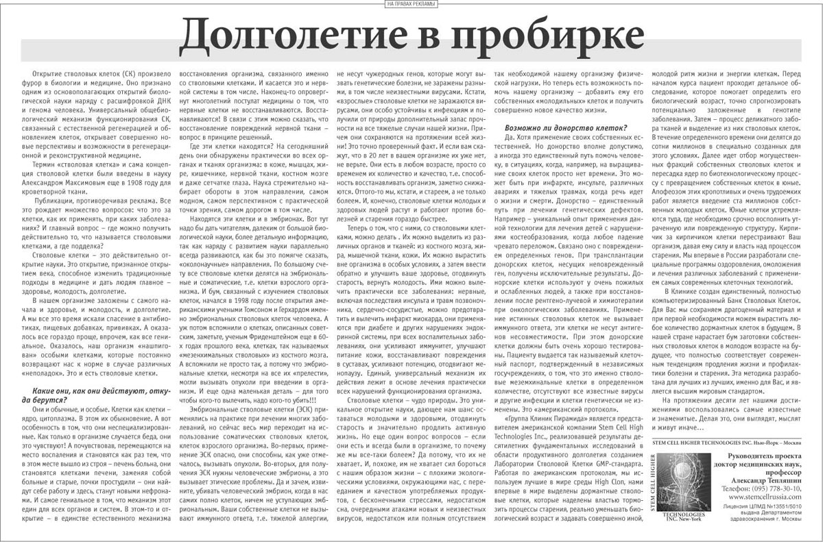 Статья в газете «Комсомольская правда» о так называемом «эликсире молодости», стволовых клетках.