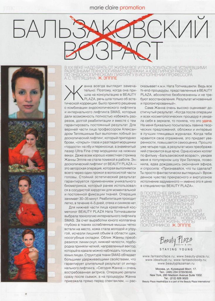 «В ХХI веке надо брать от жизни все и пользоваться не устаревшими разрезными технологиями подтяжки, а ювелирной работой по эндоскопическому лифтингу в исполнении профессора А.С. Тепляшина» Ж. Эппле