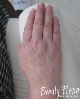 На кистях рук этой пациентки - явно выраженные пигментные пятна, морщинки, покраснения. По ее словам, "она уже пыталась уcтранить эти возрастные проблемы в салонах и клиниках родного Подмосковья, но безрезультатно…